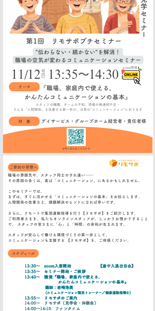 \ご参加ありがとうございました!/【第1回 リモサポ プチセミナー 無事終了いたしまし 今回のテーマは「職場・家庭で使える かんたんコミュニケーションの基本」。 セミナーでは、職場で起こりがちな“伝わらない・続かない…”… 続きを読む »第1回 リモサポ プチセミナー終了
