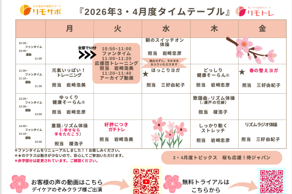 リモサポ・リモトレ会員の皆さま 梅の香りに誘われ、思わずお出かけしたくなる季節となりました。皆さま、お元気でお過ごしでしょうか。 いつもリモトレをご利用いただき、誠にありがとうございます。お待たせいたしました。【3・4月… 続きを読む »2026年3・4月度スケジュール